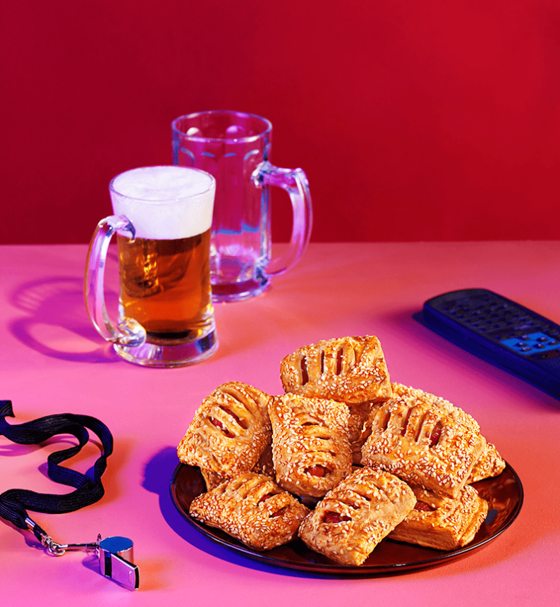 Without thawing, place the Sousaminia with sausage ketchup and mustard in a baking paper-covered pan or a greased tray.