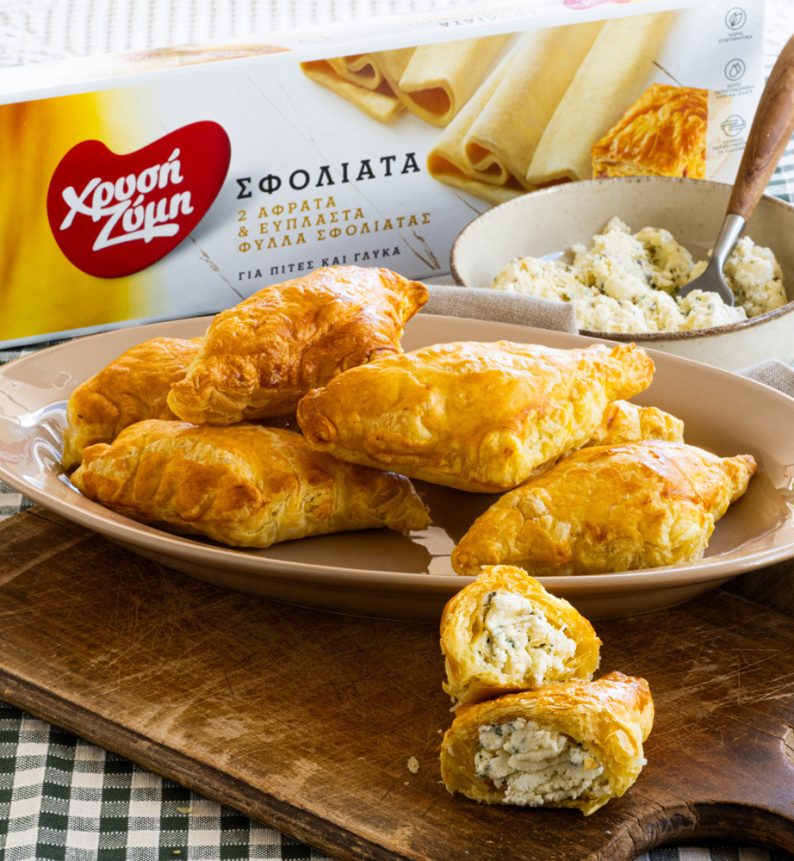 Cut the puff pastry into small 10×10 cm squares, place a tablespoon of the filling in the center, brush the edges with a little water, and fold into a triangle shape, pressing the edges to seal and creating small pleats. Place the cheese pies on a shallow baking tray lined with non-stick paper, brush them with the beaten egg using a pastry brush, and bake in a preheated oven at 200°C (392°F), using the fan setting, for 20-22 minutes.
