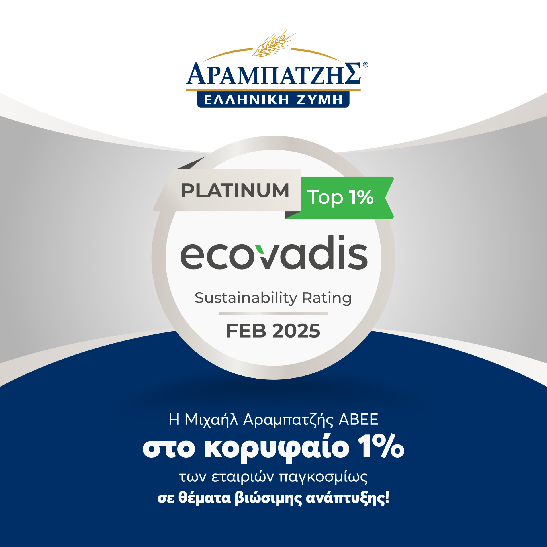 Η Μιχαήλ Αραμπατζής Α.Β.Ε.Ε.-Ελληνική Ζύμη κατέκτησε Πλατινένια διάκριση στη διαδικασία αξιολόγησης επίδοσης βιωσιμότητας EcoVadis, γεγονός που την κατατάσσει στο κορυφαίο 1% των εταιριών που αξιολογούνται από τον φορέα διεθνώς, συγκεντρώνοντας άριστη βαθμολογία.