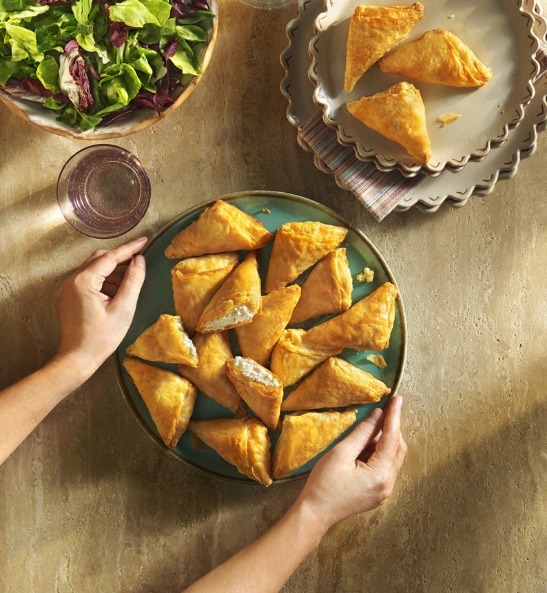 Χωρίς να τα αποψύξετε, τοποθετείτε τα Σπιτικά Τρίγωνα σε ταψί με λαδόκολλα ή αλειμμένο με λίγο λάδι.