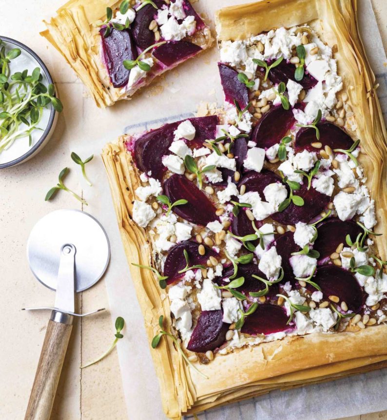 Μοιράζουμε το μείγμα των παντζαριών πάνω στο φύλλο κρούστας, αφήνοντας ένα περιθώριο 2 εκ. γύρω-γύρω. Θρυμματίζουμε από πάνω τη φέτα και πασπαλίζουμε με το κουκουνάρι.