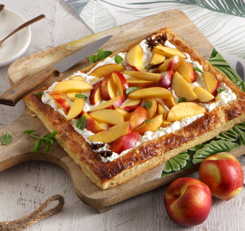 Με ένα πιρούνι πατάμε το κέντρο της σφολιάτας που έχει φουσκώσει. Αφήνουμε την σφολιάτα να κρυώσει εντελώς. Απλώνουμε την χτυπημένη σαντιγί στην επιφάνεια της σφολιάτας. Σουρώνουμε πολύ καλά τα νεκταρίνια και πετάμε την κανέλα και τον αστεροειδή γλυκάνισο.