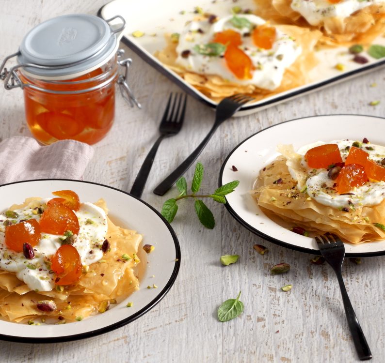 Μοιράζουμε κουταλιές από το μίγμα πάνω στα πυργάκια από τα φύλλα κρούστας. Γαρνίρουμε με φετούλες από γλυκό κουταλιού και πασπαλίζουμε με τα φιστίκια Αιγίνης.