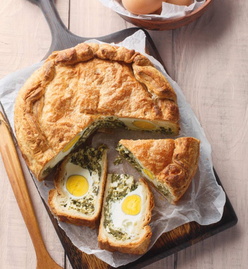 Χορτόπιτα με αυγά βραστά σημαίνει παράδοση και νοστιμιά σε κάθε κομμάτι. Η σφολιάτα Χρυσή Ζύμη συνδυάζεται με πλούσια γέμιση από χόρτα, φέτα και κεφαλογραβιέρα, δημιουργώντας μια συνταγή που ξεχωρίζει.