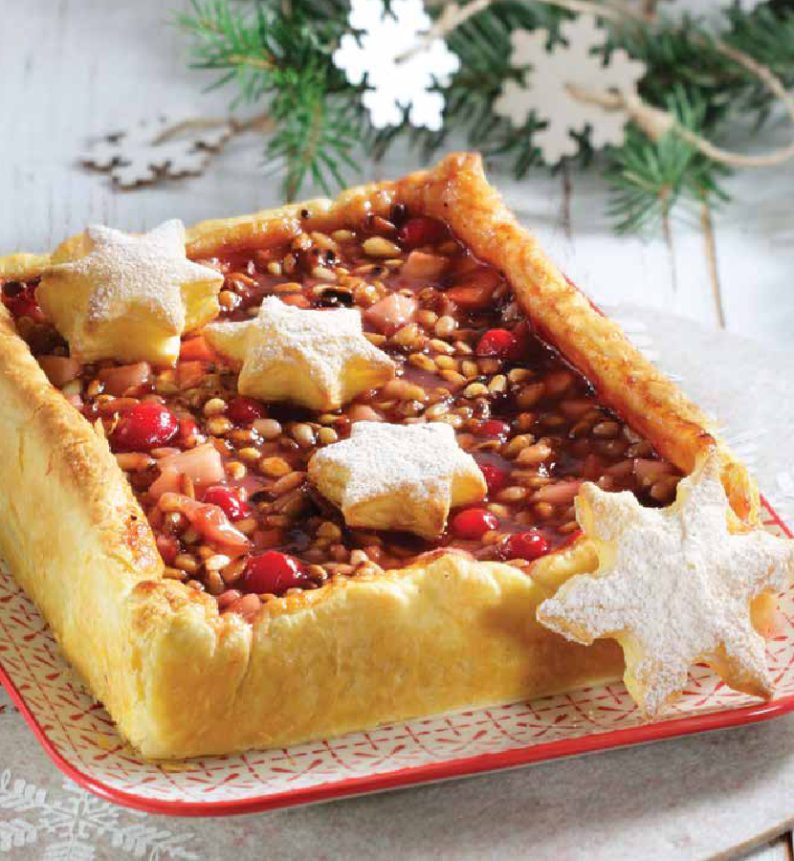 Αυτή η Χριστουγεννιάτικη τάρτα είναι ό,τι πιο αρωματικό και γιορτινό μπορείς να προσφέρεις στο τραπέζι σου! Με τραγανή σφολιάτα Χρυσή Ζύμη, ζουμερά αχλάδια, γλυκόξινα cranberries και καβουρδισμένο κουκουνάρι, δημιουργεί μια γεύση ισορροπημένη, φρουτώδη και πλούσια. Η ζάχαρη άχνη και η μαρμελάδα δίνουν τη γιορτινή πινελιά σε ένα γλυκό που κλέβει τις εντυπώσεις με την πρώτη μπουκιά.