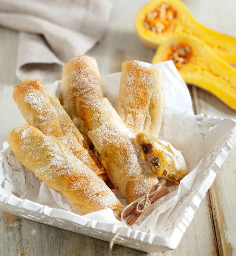 Φλογέρες με φύλλο κρούστας και κολοκύθα, ένα αρωματικό, σπιτικό γλυκό που συνδυάζει την τραγανή υφή του φύλλου Χρυσή Ζύμη με τη γλυκιά γέμιση κολοκύθας, καρυδιών και σταφίδων. Αρωματισμένες με κανέλα, μοσχοκάρυδο και ένα σφηνάκι λικέρ γαρίφαλο, γίνονται ιδανικές για τον καφέ, το τσάι ή κάθε γλυκό τραπέζι.