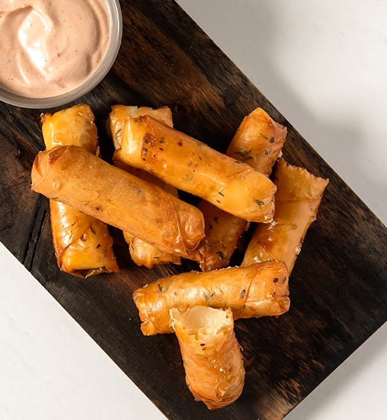 Σε ένα μπολ βάζουμε όλα τα υλικά για το ντιπ και ανακατεύουμε. Σερβίρουμε τις φλογέρες με το ντιπ.