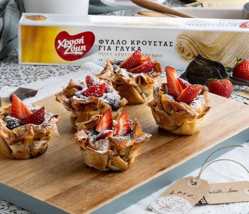 Όταν οι φωλιές είναι έτοιμες τις αποσύρετε από το φούρνο, τις σιροπιάζετε ελαφρώς, τις γεμίζετε με την κρέμα σοκολάτας, τοποθετείτε από πάνω τις φράουλες κομμένες σε τέταρτα, πασπαλίζετε με λίγη άχνη ζάχαρη και σερβίρετε.