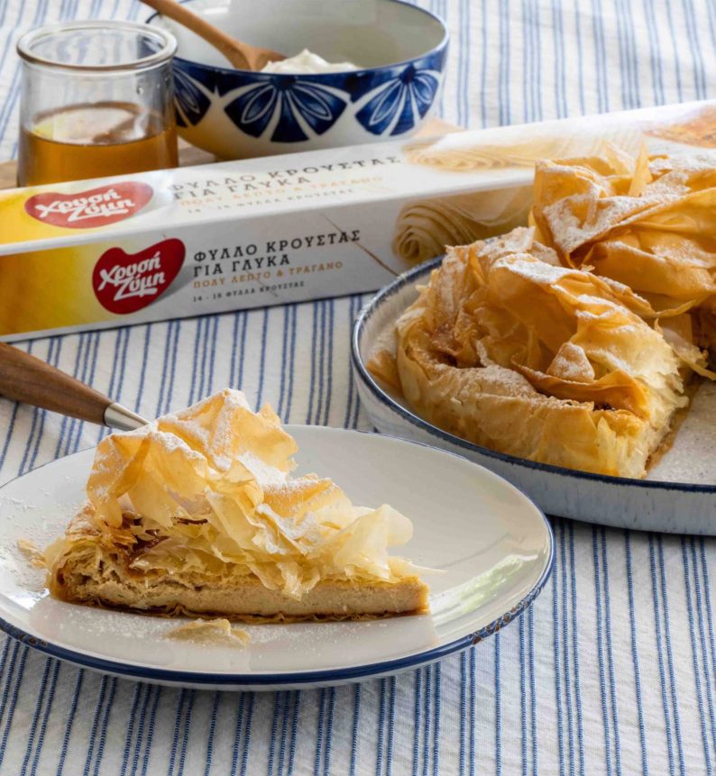 Απλώνετε ένα-ένα τα 4 φύλλα κρούστας, στο κάθε ταψάκι, αλείφοντας το κάθε ένα ξεχωριστά με το λιωμένο βούτυρο. Μοιράζετε ισομερώς το μείγμα στα 2 ταψάκια και το απλώνετε καλά σε όλη την επιφάνεια τους.