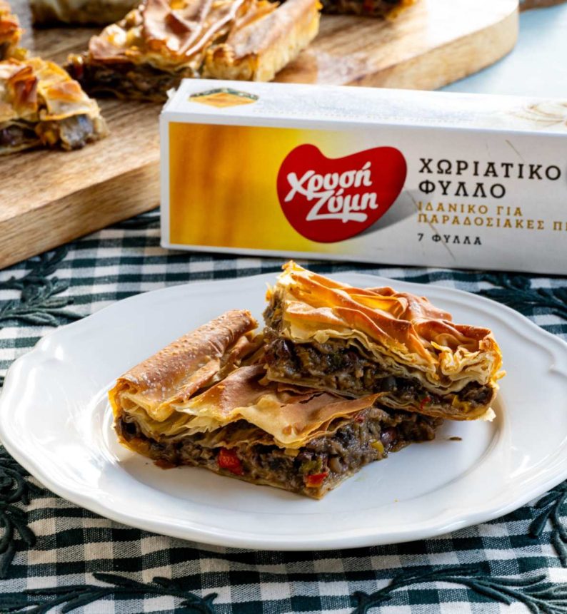 Μελιτζανόπιτα με χωριάτικο φύλλο, πολύχρωμες πιπεριές, κρεμμύδι και ελιές