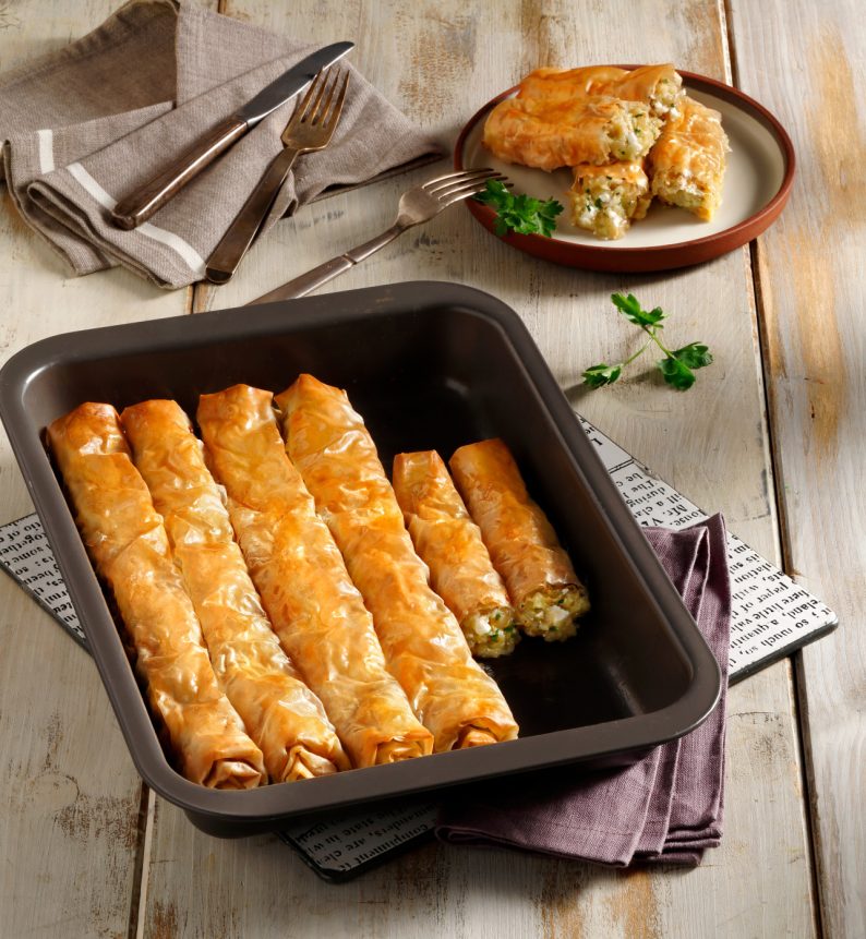 Τοποθετούμε σε επίπεδη επιφάνεια 2 φύλλα κρούστας το ένα πάνω στο άλλο αλειμμένα με λάδι. Απλώνουμε από πάνω το από τη γέμιση ομοιόμορφα. Διπλώνουμε σε ρολά τα φύλλα με τη γέμιση ξεκινώντας από τις δυο απέναντι πλευρές μέχρι που τα δύο ρολά να συναντηθούν στο κέντρο. Τοποθετούμε σε βουτυρωμένο ταψί και επαναλαμβάνουμε τη διαδικασία με τα υπόλοιπα φύλλα και την υπόλοιπη γέμιση. Πασπαλίζουμε με την υπόλοιπη τριμμένη γραβιέρα.