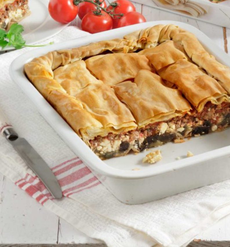 Προθερμαίνουμε τον φούρνο στους 180°C. Αλείφουμε με ένα πινέλο ένα μεγάλο ταψί με ελαιόλαδο. Βγάζουμε τα φύλλα από τη συσκευασία τους και τα ανοίγουμε πάνω σε μία επίπεδη επιφάνεια. Τα σκεπάζουμε με μία καθαρή πετσέτα για να μην χάσουν την υγρασία τους. Απλώνουμε στη βάση του ταψιού τα 4 φύλλα, λαδώνοντάς τα ένα-ένα με το πινέλο. Καλύπτουμε με μία στρώση μελιτζάνες (βάζουμε τη μία δίπλα στην άλλη χωρίς να αφήνουμε κενά). Από πάνω ρίχνουμε τη φέτα φροντίζοντας να πάει παντού και στο τέλος τον κιμά. Σκεπάζουμε με τα υπόλοιπα φύλλα, τα οποία επίσης λαδώνουμε καλά ένα-ένα.
