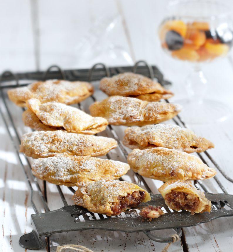 Βάζουμε στο κέντρο κάθε δίσκου 1 κουταλάκι του γλυκού από τη γέμιση και καλύπτουμε τη ζύμη σε μισοφέγγαρο, πιέζοντας τις άκρες με τα δάχτυλά μας και ραντίζοντας με λίγο νερό για να κολλήσουν.