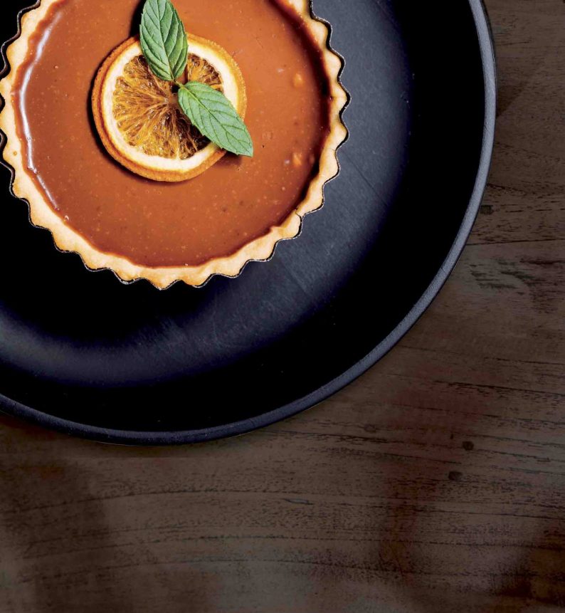 Ρίχνουμε τη γέμιση στην τάρτα και τη βάζουμε στο ψυγείο, ώστε να σφίξει. Τη σερβίρουμε, γαρνίροντας προαιρετικά με φέτες πορτοκαλιού και φυλλαράκια δυόσμου.