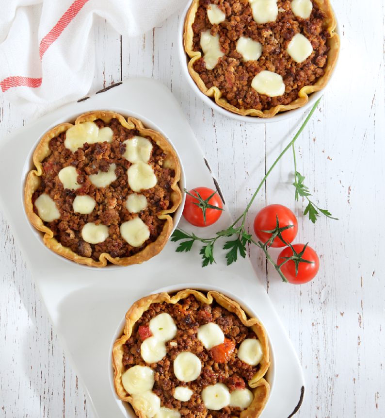 Tα ταρτάκια με κιμά είναι ο απόλυτος συνδυασμός παραδοσιακής γεύσης. Ο πλούσιος μοσχαρίσιος κιμάς μαγειρεύεται με ντομάτα και αρωματίζεται με ελαιόλαδο και κρεμμύδι, ενώ το χαλούμι προσθέτει ιδιαίτερη υφή και γεύση. Όλα αυτά τυλίγονται σε τραγανή ζύμη κουρού Χρυσή Ζύμη, δημιουργώντας μικρές, χορταστικές μπουκιές που ταιριάζουν σε κάθε περίσταση.
