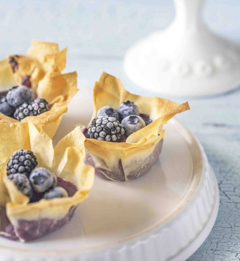 Ψήνουμε τα ταρτάκια σε καλά προθερμασμένο φούρνο στους 180ο C για 10 λεπτά. Τα αποσύρουμε από τον φούρνο, τα αφήνουμε σε θερμοκρασία δωματίου για 5-10 λεπτά και μετά τα βάζουμε στο ψυγείο για 10 λεπτά. Τα γαρνίρουμε με μύρτιλα και βατόμουρα και τα σερβίρουμε αμέσως.